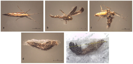 Morphological abnormalities in treated P. xylostella with sublethal concentration of farnesyl acetate at adult and pupal stages: (a) normal adult; (b,c) adult with twisted wings; (d) adult trapped in the cocoon; (e) larvae–pupae intermediates; scale bar: 1 mm.