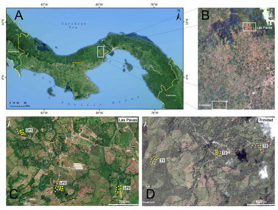 The PCW area is distributed among 3 provinces, Western Panamá, Panamá, and Colón, and comprises 7 districts: Panamá, Arraiján, La Chorrera, Capira, Colón, Portobelo, and a very small portion of Chagres. This study took place in two settlements in central Panamá (Figure 1A): Las Pavas (LP) and Trinidad de las Minas (T), located in Western Panamá Province (Figure 1B), west of the Panamá Canal (Figure 1A). The climate of the region varies with its topography and global climatic phenomena, such as “El Niño Southern Oscillation”, that are independent of land use [36].