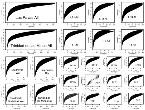 We compared the diversity by land use type according to season in the two communities. In T, there was an increase in diversity in the wooded plot from dry (29.90 ± 6.38) to wet season (41.70 ± 23.23). The partly wooded plot did not have sand fly diversity differences between dry (29.29 ± 16.86) and wet (29.82 ± 4.77) seasons. However, there was a reduction in sand fly richness at the peridomicile plot from dry (21.87 ± 11.47) to wet season (15.47 ± 2.25). In LP, the wooded plot did not show changes in diversity from dry (17.85 ± 10.01) to wet season (18.42 ± 7.07). In the partly wooded plot, we observed a small difference from dry (33.04 ± 12.94) to wet season (27.90 ± 6.38), and a drastic change from dry (33.70 ± 23.23) to wet season (14.42 ± 7.07) in the peridomicile plot. The species’ accumulation curves suggested that for LP and T diversity was thoroughly sampled only in LP1, LP2, T1, and T2 in both seasons, LP3 during the wet season, and that species sampling was incomplete in LP3 during the dry season and in T3 during both seasons (Figure 2).