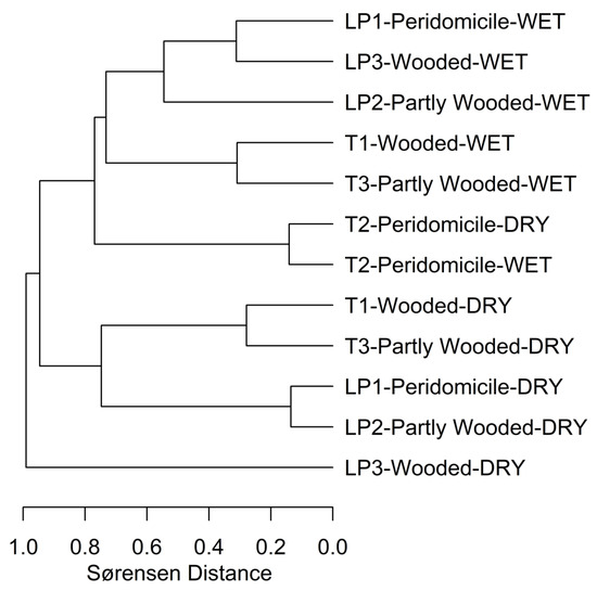Cluster analysis of the Sørensen’s dissimilarity index for each plot and collection season. Labels stand for the following: Season collected: DRY (dry season); WET (wet season); Wooded; Partly Wooded, and Peridomicile plots are indicated in the labels, where LP (Las Pavas) and T (Trinidad de las Minas) codes correspond to the locations of Figure 1.