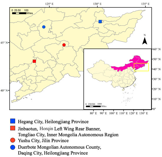 Sample woodwasps were collected from four regions during three different phases of the overwintering period (pre-winter, mid-winter and post-winter) from October 2017 to March 2018 (Figure 1). Pre-winter means from October 2017 to November 2017, mid-winter means from December 2017 to January 2018 and post-winter means from February 2018 to March 2018. The specific temperatures of the experimental sites are shown in Table 1. The sample collection sites were in Hegang City, Heilongjiang Province (HG), Jinbaotun, Horqin Left Wing Rear Banner, Tongliao City, Inner Mongolia Autonomous Region (JBT), Yushu City, Jilin Province (YS) and Duerbote Mongolian Autonomous County, Daqing City, Heilongjiang Province (DM).
