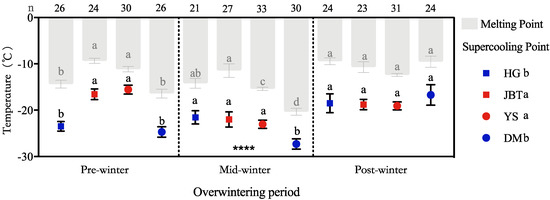During the pre-wintering period, the SCP of the JBT and YS populations were significantly higher than that of the other populations (t = −8.02; df = 61.02; p < 0.001) (Figure 2 and Figure 1: HG-Hegang, JBT-Jinbaotun, YS-Yushu, DM-Duerbote Mongolian). The SCPs of the DM population during the mid-wintering period were lower than that of the other populations (t = −3.50; df = 51.51; p < 0.001). The SCP values (mean ± SE) were −22.48 ± 0.92 °C for the HG population (n = 71), −18.03 ± 0.83 °C for the JBT population (n = 74), −19.34 ± 5.87 °C for the YS population (n = 94) and −24.11 ± 1.00 °C for the DM population (n = 80). Moreover, the differences in the SCPs with respect to collection sites were also observed (F = 16.63; df = 3, 318; p < 0.001), which were mainly divided into two categories: the northern regions (DM and HG) and the southern regions (JBT and YS) (Figure 2).