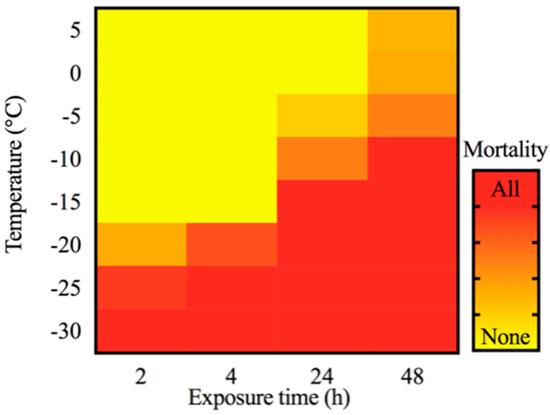 Low temperature stress-induced mortality of the overwintering larvae increased with a decreasing temperature. When the larvae were exposed to a low temperature for less than 4 h, most samples survived above −15 °C; when the duration of stress exposure was 24 or 48 h, most of the larvae survived above −5 °C (Figure 3). In contrast, when larvae were exposed to a low temperature for 4 h, less than 30% survived below −20 °C.