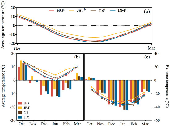 Historical climate data for the sampling sites (1981–2010). (a) Historical daily average climate data of the sampling sites (1981–2010). Only the overwintering periods were analyzed. Different letters in the same column indicate a significant difference with 95% confidence (LSD test). (b) Bars represent monthly average high temperatures, which correspond to the left Y axis. Lines show monthly extremely high temperatures, which correspond to the right Y axis. (c) Bars show monthly average low temperatures, which correspond to the left Y axis. Lines show monthly extremely low temperatures, which correspond to the right Y axis.