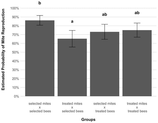 Estimated probabilities of reproduction (±SE) of female mites, Varroa destructor, in experimentally infested worker brood cells of the different honey bee, Apis mellifera, host groups (selected-selected, treated-selected, selected-treated, treated-treated). After adjustment for multiple comparison (Tukey method), significant differences were detected between groups as indicated with letters above the bars (GLMM: χ2 = 9.832, p = 0.02). Both the highest and the lowest reproductive probabilities were detected in mites infesting AWD surviving bees, where selected-associated mites showed a statistically higher reproductive capacity than treated-associated one.