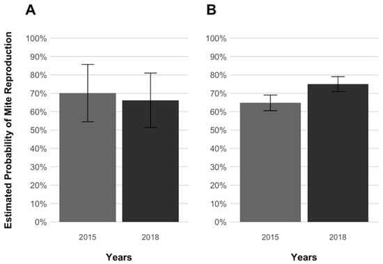 Temporal comparison of the estimated probabilities of reproduction (±SE) of female mites, Varroa destructor, from treated colonies in experimentally infested worker brood cells of Apis mellifera selected (A) and treated (B) colony groups. Earlier data (2015) from Panziera et al. [] are in light grey and present data (2018) in dark grey. The earlier data refer to the groups AWD (treated-selected) and C (treated-treated) as reported in Panziera et al. []. No significant differences were detected between the estimated probabilities.