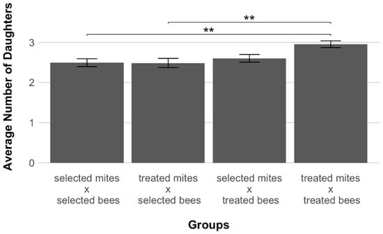 Average number of daughters (±SE) produced by female mites, Varroa destructor, in experimentally infested honey bee, Apis mellifera, worker brood cells of the different host groups (selected-selected, treated-selected, selected-treated, treated-treated). After Bonferroni adjustment, significant differences were detected between groups (** = p < 0.01). Both selected and treated mites infesting selected bees produced significantly less daughters than treated-associated mites infesting their original host.