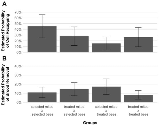Estimated probabilities of honey bee, Apis mellifera, worker brood cell recapping of (A) and brood removal in (B) mite, Varroa destructor, experimentally infested cells in the different host groups (selected-selected, treated-selected, selected-treated, treated-treated). Error bars indicate standard error of the mean. There were no significant differences between the tested groups for either cell recapping (GLMM: χ2 = 6.991, p = 0.072) or brood removal (GLMM: χ2 = 5.763, p = 0.123).