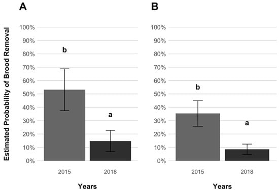 Temporal comparison of the estimated probabilities of worker brood removal (±SE) in selected (A) and treated (B) groups of Apis mellifera cells experimentally infested with Varroa destructor mites associated with treated colonies. Earlier data (2015; Panziera et al. []) are indicated in light grey and present data (2018) in dark grey. The earlier data refer to the groups AWD (treated-selected) and C (treated-treated) as reported in Panziera et al. []. Significant differences were detected when comparing the probabilities of brood removal across time for both host groups as indicated by different letters (p = 0.035 and p = 0.006, respectively).