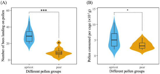 (A) Pollen diet preferences and consumption. Number of landings by workers in the dual choice test of apricot pollen and pear pollen diets; (B) Consumption of pollen in the dual choice test. Violin plots showing these results; the violin shape shows the distribution of the values, and there is a box plot inside. The black line in the center indicates the median, the top of the black box represents the upper quartile, and the bottom of the black box represents the lower quartile. Asterisks represent the level of significance. * p < 0.05 and *** p < 0.001.