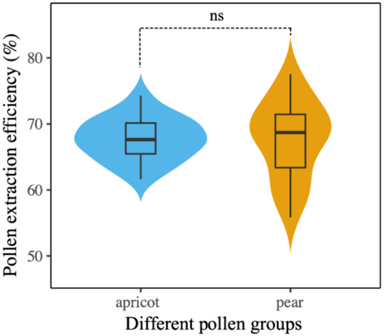 Pollen extraction efficiency for apricot pollen and pear pollen in the rectum of Apis. mellifera workers. Violin plots showing these results; the violin shape shows the distribution of the values, and there is a box plot inside. The black line in the center indicates the median, the top of the black box represents the upper quartile, the bottom of the black box represents the lower quartile, and ns means no significance (p > 0.05).