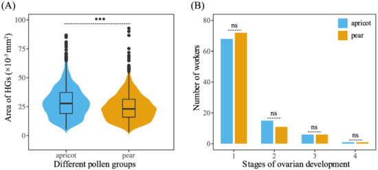 (A) Hypopharyngeal gland (HG) development of workers fed apricot pollen and pear pollen diets; (B) Ovarian development of workers fed apricot pollen and pear pollen diets. Violin plots showing these results; the violin shape shows the distribution of the values, and there is a box plot inside. The black line in the center indicates the median, the top of the black box represents the upper quartile, the bottom of the black box represents the lower quartile, and the black dots indicate outliers. Asterisks represent the level of significance. *** p < 0.001, ns p > 0.05.
