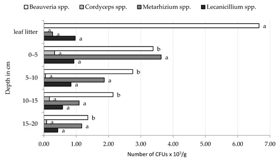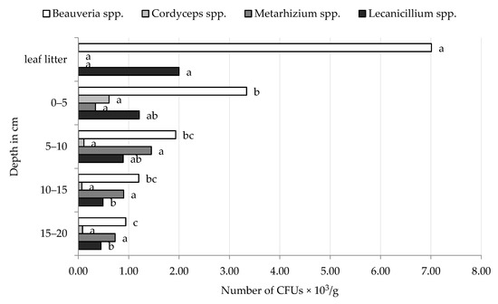 Among the EPF that were isolated from forested habitats, Beauveria spp. and Lecanicillium spp. were most abundant in leaf litter; their density in soil gradually decreased in deeper soil depths (Figure 1 and Figure 2).