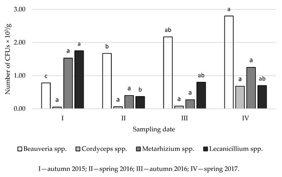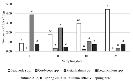 The current study shows that the abundance of EPF varies depending on the time of the study (Figure 3 and Figure 4). The highest densities of Beauveria spp. and Lecanicillium spp. were found in Golice in the spring of 2017, and the greatest abundance of Cordyceps spp. was observed in spring 2016. Metarhizium spp. were most abundant in autumn 2015 compared to other sampling dates (Figure 3).