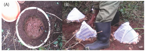 Two replicates of four treatment types were used to assess macronutrient transfer. The limited number of replicates was used as logistics, and sampling time was limited by the availability of Kenya Wildlife Services security personnel. Each treatment involved an experimental mesocosm containing exclosures consisting of 40 L (height: 50 cm × width 40 cm) plastic buckets buried with the top lips flush with the soil surface. Further, 40 L of excavated soil (sifted with a 2 mm aperture to remove debris and macroinvertebrates) was placed into each bucket until it was completely filled. Freshly deposited elephant dung was collected from the top section of boli, rejecting dung in contact with the ground to avoid soil contamination. Similarly, dung contaminated by urine was not used. Dung was shaped into hemispherical 1 L pats and frozen for 20 h to kill any macroinvertebrates present. Dung pats were defrosted at room temperature and one dung pat was placed on top of each soil-filled bucket and the dung beetles for each treatment type were added (Figure 1). A pyramidal structure of wooden poles wrapped in 1.2 mm gauge netting placed above each bucket prevented ingress or egress of dung beetles during the experiment (Figure 1). In the control treatment, a dung pat was placed but no beetles were added. The experiment ran for 112 days from the 28 April 2015, covering the expected completed lifecycle for all species used in the experiment, thus allowing the action of both adult and larval dung beetles to be recorded [22]. The Aberdare National Park is located almost directly on the equator, and there is little fluctuation in annual temperatures, which may have affected the dung decomposition rate.