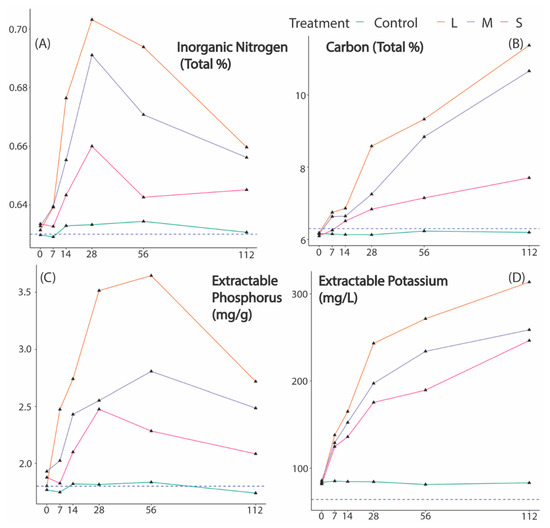 Changes in the soil nutrient contents: (A) total nitrogen, (B) total carbon, (C) extractable phosphorus, and (D) extractable potassium over 112 days. The horizontal dashed lines are published evidence of the baseline bioavailable nutrients found in Nicholson (1976) [27], a previous study in the same area and soil type as the current study.