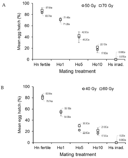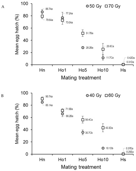 Egg hatch in Ae. aegypti that mated under field-cage conditions varied significantly with mating treatment (F4,20 = 87.57; p < 0.0001) but not with dose (F1,20 = 2.37, p = 0.1392), although the treatment–dose interaction was significant (F4,20 = 2.92, p = 0.0473) (Figure 3A). The percentage of egg hatch steadily decreased from 79.6–86.7% in the fertile male controls (Hn) to 0.3–0.4% in the irradiated male controls (Hs), with decreasing values in the other treatments (Figure 3A). The interaction effect appeared to involve the low egg hatch value (28.2%) observed in the Ho5 (1:5 fertile:irradiated males), 50 Gy treatment, compared to that in the Ho5, 70 Gy treatment (51.7%).