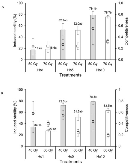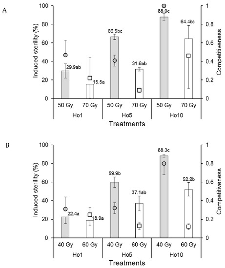 Induced sterility is the prevalence of egg sterility resulting from females that undergo mating in the presence of irradiated males [28,31]. As such, it is the key driver of population decline in areas in which irradiated males have been released. Induced sterility was lower in treatments involving higher doses of irradiation in laboratory and field cages in both species, except for Ae. aegypti that mated in the laboratory for which the dose had no significant effect (Figure 2A). In all cases, the prevalence of induced sterility increased with the ratio of fertile:irradiated males in the different mating treatments. Our field-cage studies indicated that 88% of induced egg sterility was achieved in the 1:10 fertile:irradiated male treatment (Ho10) in both Ae. aegypti and Ae. albopictus at doses of 50 and 40 Gy, respectively, which is a promising result that requires testing in pilot-scale field studies. Others have reported induced sterility of 74% in Ae. albopictus at a 1:7 fertile:irradiated male mating regime [36] or up to 79–88% in Mexican and Brazilian strains of Ae. aegypti that had been infected with Wolbachia prior to irradiation [32].