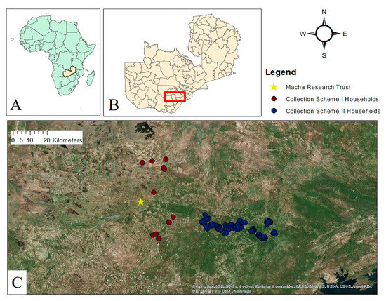 All study households (n = 150) were located within an 81 km radius of Macha Research Trust (MRT), located at an elevation of 1100 m above sea level at 16.39292° S, 26.79061° E, within Choma District in Zambia’s Southern Province (Figure 1). The ecotype around the field station is primarily miombo woodland. The region experiences three seasons: a cool dry season (typically from May through July), a hot dry season (typically from August through October), and a rainy season (typically from November through April).