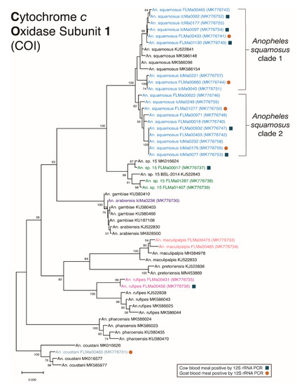 Of the sample set brought to JHSPH, a subset was run on a PCR that amplifies the Barcode of Life Database (BOLD) molecular target of the cytochrome c oxidase subunit I (COI) gene [40]. Any samples that were not assigned to species using the ITS2 PCR with or without the addition of the “An. squamosus primers” were included in this subset. Additional samples were included in this analysis to ensure samples sequenced were representative of the larger dataset by selecting every 10th sample from the dataset. The GPS coordinates for each sample were then plotted to ensure the selected samples were spatially representative. This fragment of the COI gene was amplified using the previously described LCO1490 and HCO2198 primers, and each 25 μL PCR reaction had the same mixture components previously used and identical thermocycler conditions [40,46]. All PCR products were visualized by electrophoresis on 2% agarose gels stained with ethidium bromide. All samples that produced the ~700 bp band were then purified using a QIAquick PCR Purification Kit (Qiagen, Hilden, Germany) and sent to the Johns Hopkins Medical Institutions (JHMI) Synthesis and Sequencing Facility for Sanger sequencing. Forward and reverse sequences obtained from the JHMI facility were imported into Geneious (Biomatters, Auckland, New Zealand) version 11.1.5 (https://www.geneious.com) and trimmed to remove low-Phred quality ends. Forward and reverse sequences were pairwise aligned to create one consensus sequence for each sample. Each individual sample sequence was compared against the NCBI database using BLASTn, and samples were identified as a specific species when there was a minimum nucleotide identity of 95% and a significant E-value <1 × 10−5. All COI consensus sequences were trimmed to a final length of 671 bp and submitted to GenBank. These sequences were further utilized for the phylogenetic analysis.