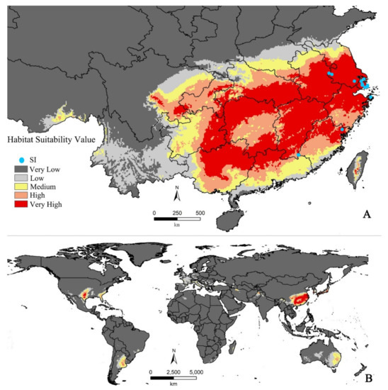 Potential geographical distribution of SI by MaxEnt; (A) potential distribution in China; (B) potential world distribution. SI: sweetgum inscriber.