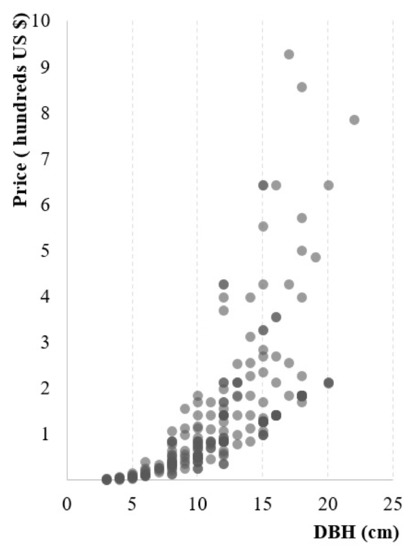 The market price of American sweetgum in different DBH at 2019–2020. DBH: diameter at breast height.