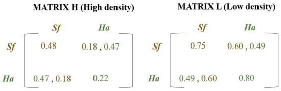 Payoff matrices containing the survival probabilities of Helicoverpa armigera (Ha) (green values) and Spodoptera frugiperda (Sf) (brown values). The matrices represent the payoffs given the inter + intraspecific interactions (principal diagonal) or only interspecific interactions (secondary diagonal) for states with high population densities (MATRIX H (High density)) or low population densities (MATRIX L (Low density)). These results were obtained in the biological experiments and they are expressed in Figure 2A–C (Section 3). (For a color version of this figure, the reader is referred to the web version of this article.).