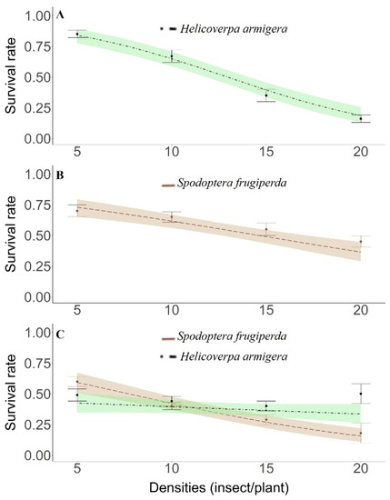 In-field survival rate (mean ± SE) of Spodoptera frugiperda and Helicoverpa armigera larvae isolated (intraspecific competition only) and combined (intra- and interspecific competition). Dashed curve corresponds to the observed data, while the colored areas are the confidence regions (95% CR) predicted by the generalized linear model with binomial distribution. (For a color version of this figure, the reader is referred to the web version of this article.). (A) Only H. armigera; (B) Only S. frugiperda; (C) S. Frugiperda + H. armigera.