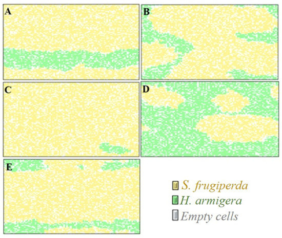 The simulations revealed that, over the course of 80 generations (Figure 3a–d), S. frugiperda was the dominant species in all scenarios with exception only in the scenario of adopting insecticide control and resistance of only H. armigera to the insecticide, where there was dominance of H. armigera (Figure 3d). The greatest negative impacts on the population dynamics of H. armigera were with the use of insecticide control and with the occurrence of S. frugiperda resistance to the insecticide, providing the formation of small islands of its competitor (Figure 3c). Similarly, despite the resistance of both species to the insecticide used in the refuge areas (Figure 3e), the patch competition between larvae ne-gatively impacted the H. armigera population.