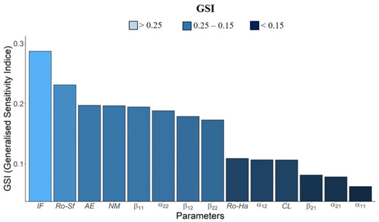 We measured the impacts of fluctuations in parameters of our model on the outputs. The sensitivity analysis is based on a unique Principal Component Analysis (PCA). The sensitivity indices were estimated based on the weighted participation of each parameter in the main components, thus calculating the generalized sensitivity index, according to the method described by Lamboni et al. [36] in the R package multisensi [37]. The parameter values for sensitivity analysis were obtained through uniform distribution (Table 1).
