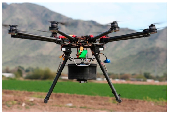 The OKSIR program was established in 1992 with the stated goal of eradicating the codling moth from the Okanagan and surrounding valleys [7,8]. While eradication was never achieved, this program has conducted an effective, area-wide integrated pest management program (AW IPM), with SIT as the key component for more than 25 years [7,9]. During this time, research was conducted to advance the field of the codling moth SIT and promote its uptake globally [2]. Most of this research focused on optimizing the radiation dose to leverage IS [10,11,12,13], improving rearing methods [14,15,16], and integrating SIT with other pest management strategies [17]. Other research has served to identify limitations in the OKSIR program’s operations [18,19,20] or evaluate the global expansion of codling moth SIT [21,22,23]. Until a recent cooperative research program hosted by the International Atomic Energy Agency, there has been a comparative dearth of research evaluating release methods for sterile codling moth SIT [23]. Since the establishment of the cooperative program in 2016, uncrewed, fixed, and rotary-winged aircraft have been used operationally for five years in a test of over several hundred hectares of apple orchards in New Zealand using insects supplied by OKSIR [23]. Similarly, uncrewed rotary-wing aircraft (Figure 1) have been used to release sterile codling moths over an area of 1000 ha in experimental and commercial applications in Washington State, USA.