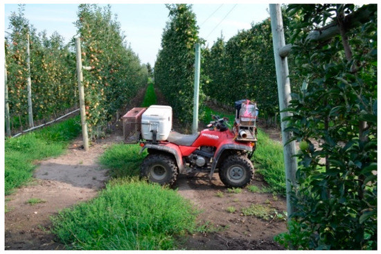 Aerial release with crewed, fixed-wing aircraft is the preferred method for most large AW IPM programs utilizing SIT [30]. Aerial release from crewed, fixed-wing aircraft rapidly delivers insects with excellent fitness in a uniform distribution. However, high fuel, pilot, and hangar costs make this a very expensive method, often amounting to more than a quarter of the operating budget of SIT programs [30]. Manned aircraft are also not suitable for release in a fragmented landscape where a more targeted release is required [30]. The OKSIR program explored the use of a crewed, fixed-wing aircraft (Cessna 205) to release sterile insects in 2003, but this method was fraught with logistical challenges (OKSIR, unpublished data). Rotary-wing aircraft were used for the aerial release of sterile codling moths early in the development of the OKSIR program, but this approach was ultimately deemed too expensive [8,31]. Instead, the OKSIR program has used modified all-terrain vehicles (ATVs) (Figure 2) to conduct moving, ground releases of sterile insects since it started releases in 1994 [28]. However, this procedure exposes the chilled sterile insects to significant stress during the transport and release process [18]. It has been argued [18] that the negative impacts of transportation and cold storage needed for ground release outweigh the numerous improvements to the codling moth SIT methods that have been developed in the last 25 years. Ground release methods also require a substantial amount of time and staff, and release vehicles are often restricted to roads or orchard rows, resulting in a less uniform distribution of insects [30]. The growing use of uncrewed aircraft systems (UASs) in agricultural applications present opportunities to deploy aerial release technology in situations in which the costs were previously prohibitive [32]. As part of the International Atomic Energy Agency Cooperative Research Program on “Improved Field Performance of Sterile Male Lepidoptera to Ensure Success in SIT Programs”, our Canadian, US, and New Zealand team conducted experiments to explore basic operational parameters to determine how a UAS might be used to release sterile codling moths in the context of the OKSIR program and to establish more universally useful guidelines for other programs. Aerial releases with UASs were evaluated against the standard ground release methods used by the OKSIR program. Given the widely accepted superiority of aerial release methods and the increasing use of UASs in agriculture, we hypothesized that aerial release from a UAS would be more effective than the ground release methods currently employed by OKSIR.