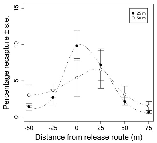 Figure 3. Mean percentage of recaptured moths vs. distance from the aerial release route (m). Each distance from the release route represents the sum of 11 traps in the grid at the specified distance from the release route for each replicate. Points represent week-long total recaptures averaged across replicates ±1 standard error for each distance (n = 6). Black and white points represent recaptures of moths that were release from 25 or 50 m above ground, respectively.