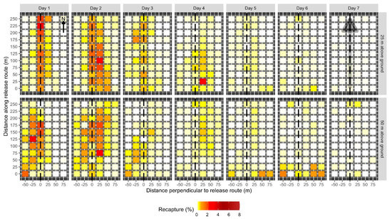 Figure 4. Spatial pattern of daily male codling moth recaptures when released from 25 m (top row) or 50 m (bottom row) above ground. Each day and altitude combination was replicated 6 times. Each colored cell represents the mean percentage of moths recaptured at a given location on a given day on a 25 m × 25 m grid of pheromone-baited traps. The intensity of shading in the cell corresponds to percentage recapture (see legend). The dashed line indicates the location of the release route over the plot. Locations of each trap along the plot and the distance perpendicular to the release route in m are indicated on the axes. Recaptures are scaled such that the sum of all cells for all seven days for a given release height equals 100%. The arrow in the upper left panel indicates plot orientation relative to north. Prevailing winds were out of the north. The shaded gray arrow in the top right panel indicates the location and direction of the release route.