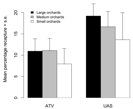 Figure 5. Mean percentage of moths recaptured in small, medium, and large orchards when released from an all-terrain vehicle (ATV) or uncrewed aerial system (UAS). Height of bars indicates the average percentage recapture (+1 standard error) from four replicated releases.