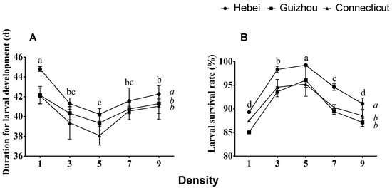 Effects of larval density and geographical population on (A) the duration of larval development, in days and (B) larval survival (%) of gypsy moths collected from Hebei and Guizhou, China, and Connecticut, USA. The means ± SE for these traits are plotted against larval density. Two-way ANOVA was used, followed by Tukey’s method for the post hoc comparisons at α = 0.05. The populations (italicized letters) and larval densities (letters in normal type) designated with different letters are significantly different.