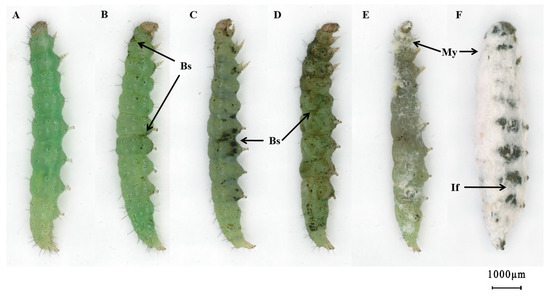 The external symptoms of Plutella xylostella larvae exposed to Cordyceps fumosorosea strain IFCF01, observed under a stereoscope. (A) Control group larva; (B) black spots (Bs) appeared on the larval cuticle at 8 h post-exposure; dark spots appeared on the entire body of diamondback moth larvae after 16 h (C) and 24 h (D) post-exposure; (E) mycelia (My) develop on the dead larval cadaver after 48 h post-exposure, while intersegmental folds (If) showed dense mycelial mass; (F) mycelia entirely covered the cadaver after 72 h post-exposure.