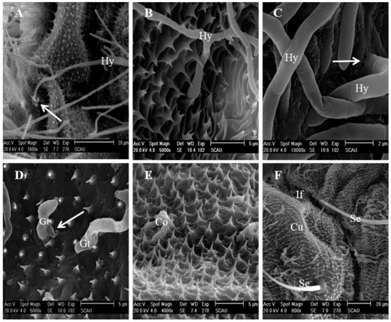 Penetration sites were rarely seen on the cuticle, except for a few individual conidia with penetration pegs, which were observed after 24 h post-inoculation with IFCF-D58 (Figure 4D). The primary appressorium was frequently malformed (Figure 4E,F). The surface of the ungerminated and non-viable conidium was distinctly shriveled compared to germinated conidium (Figure 4E). Germinated conidia showed malformed appressoria (Figure 4F). Cuticles did not inhibit germination and initial hyphal growth, but prevented hyphal development and caused growth distortion of C. fumosorosea IFCF-D58.