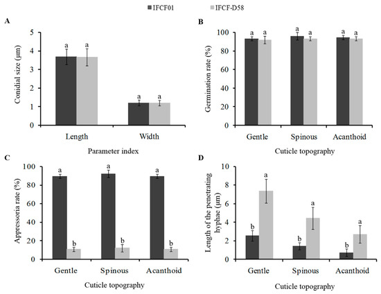 Comparison of conidial growth parameters of Cordyceps fumosorosea strains IFCF01 and IFCF-D58 on different cuticle topographies of Plutella xylostella larvae. (A) Conidia size, (B) Germination, (C) Appressoria, and (D) Penetration. Different lowercase letter(s) above the bars in the same cuticle topography indicate statistically significant differences (Tukey’s HSD test; P < 0.05).