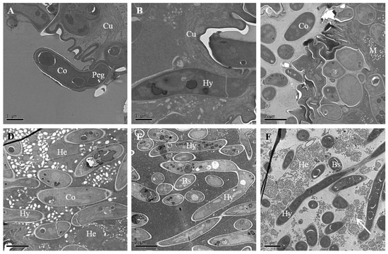 Stepwise invasion events of Cordyceps fumosorosea IFCF01 on the host integument visualized under transmission electron microscope. (A,B) were taken at 16 h after inoculation; (A) The tip of the conidia has differentiated into a penetration peg (Peg); (B) Hypha (Hy) has penetrated into the cuticular layer of the cuticle (Cu); (C) Hyphae have penetrated the cuticle and muscle (M) at 24 h after inoculation; (D,E) were taken 36 h after inoculation; (D) Hypha (Hy) and conidium (Co) have entered the muscle; hyphal bodies reproduced by created cell develop into blastospores (Bs). The hemocoele (He) has been colonized by blastospores; (E) Self-reproduction of the hyphal body (HB) was visible in the body cavity; (F) Hemocyte (He) damage (at arrow) was clearly visible, with disappearance of the nucleolus at 48 h after inoculation.