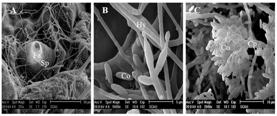 SEM photographs of conidia development of Cordyceps fumosorosea IFCF01 on the cuticle surface of Plutella xylostella larvae. (A) Development of hypha on the cuticle and around the spiracle (Sp) after 36 h post-inoculation. Fa = filter apparatus; (B) Hyphae developed, and differentiated to form a dense mycelial mass on the cuticle after 60 h post-inoculation; (C) Conidia development after 72 h post-inoculation, mature conidium (Co) is still attached to the conidiophores (Cp).