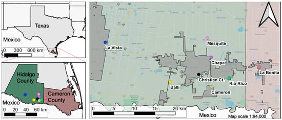 The study took place in the counties of Hidalgo (26°06′10.91″ N, 98°15′16.25″ W) and Cameron (26°09′49.69″ N, 97°49′26.36″ W), which are part of the region known as LRGV in South Texas, US (Figure 1). There are an estimated 1.3 million inhabitants within these counties, of which 90% considered themselves of Hispanic or Latin origin, 85% speak Spanish and at least 29% live in poverty [,]. Within these counties, there are several un-incorporated communities called ‘colonias’, usually inhabited by families of Hispanic heritage who often live in low-income housing and lack city services such as waste management, paved roads, and potable water [,,]. The climate in this region is considered humid sub-tropical, with a cold/dry season from November to February (7–21 °C), and a rainy season that starts in April (18–30 °C), peaks in September (23–33 °C), and finishes in October (19–31 °C) [].
