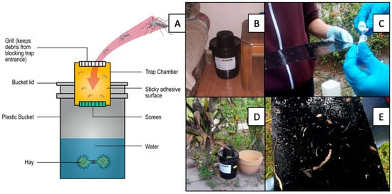 Pictorial diagram and field usage of the AGO trap (Source: CDC, Spring Star, King 5–modified). (A) Diagram of the features and components of the AGO trap. (B) Indoor placement of AGO. (C) Mosquito method of collection from glue board. (D) Outdoor placement of AGO. (E) Field view of a glue board that needs replacement.