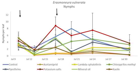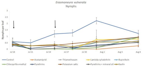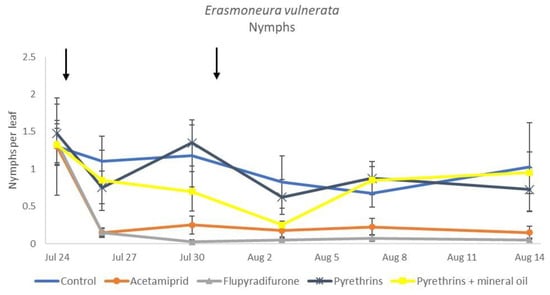 Dynamics of Erasmoneura vulnerata nymphs (mean ± std. err.) in the 2019 trial. Insecticides were applied one (first arrow) or two times (second arrow, see Materials and Methods section).
