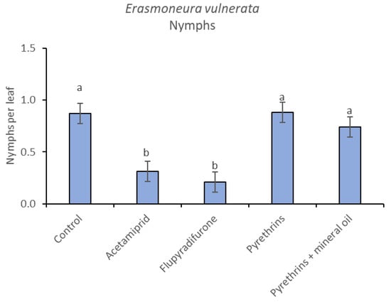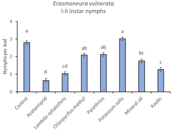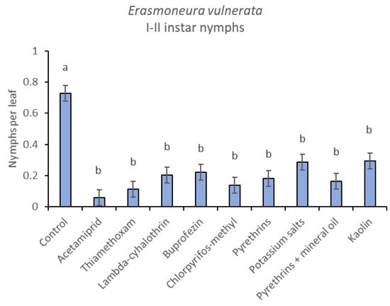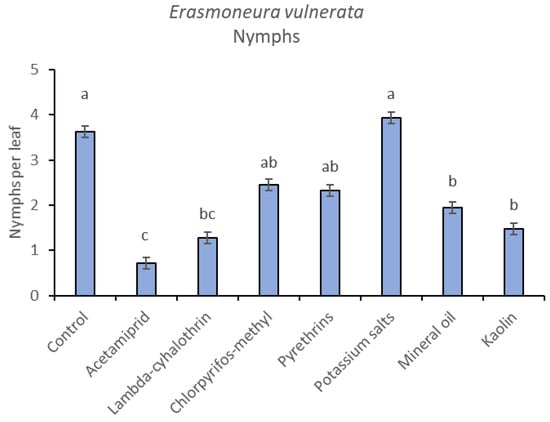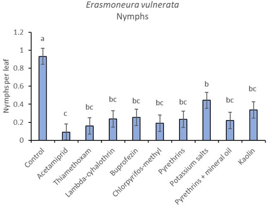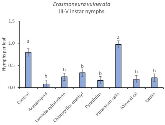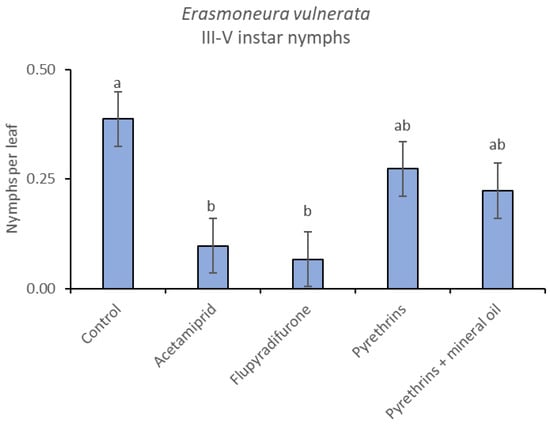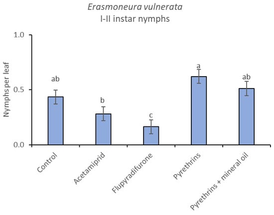 Least-square means (± std. err.) of Erasmoneura vulnerata nymphs observed on different treatments in the 2019 trial. Different letters indicate significant differences at t-test (α = 0.05).