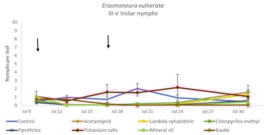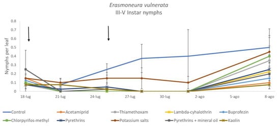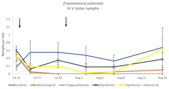 Dynamics of Erasmoneura vulnerata older (III-V instar) nymphs (mean ± std. err.) in the 2018 trial. Insecticides were applied one (first arrow) or two times (second arrow, see Materials and Methods section).
