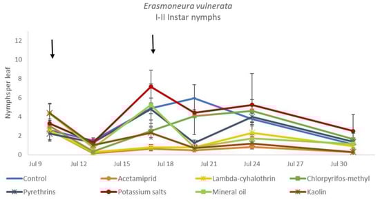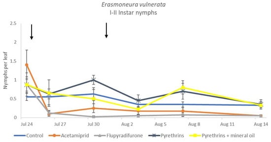 Dynamics of Erasmoneura vulnerata early (I-II instar) nymphs (mean ± std. err.) in the 2019 trial. Insecticides were applied one (first arrow) or two times (second arrow, see Materials and Methods section).