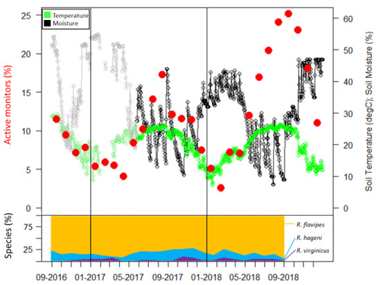 Active monitors, soil temperature, and soil moisture over 28 months. Species identifications were only determined for the first 24 months and percentages of each species are presented as a stacked line graph (bottom portion). The gray and light green portion of graph are data obtained from the USDA Natural Resources Conservation Service Soil Climate Analysis Network data for Beaumont, TX, USA.