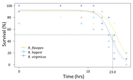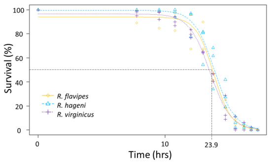 To test the ability to withstand desiccation, groups of termites from two to three colonies of R. flavipes, R. hageni, and R. virginicus (n = 100 individuals per colony) were put into a desiccation chamber maintained at 0% relative humidity as done in Burdine and McCluney [34]. Mortality was visually assessed every 3–6 h until all individuals were deceased (54 h). Probit analysis in R v-3.4.1 [33] was used to determine the LT50 and LT90, or the time it takes to kill 50% and 90% of the individuals, respectively, to compare the ability to tolerate desiccation for each colony.