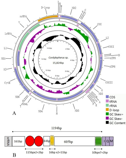 (A) Mitochondrial genome map of Cordylepherus sp.; (B) organization of the A + T-rich regions in the mitochondrial genomes of Cordylepherus sp.